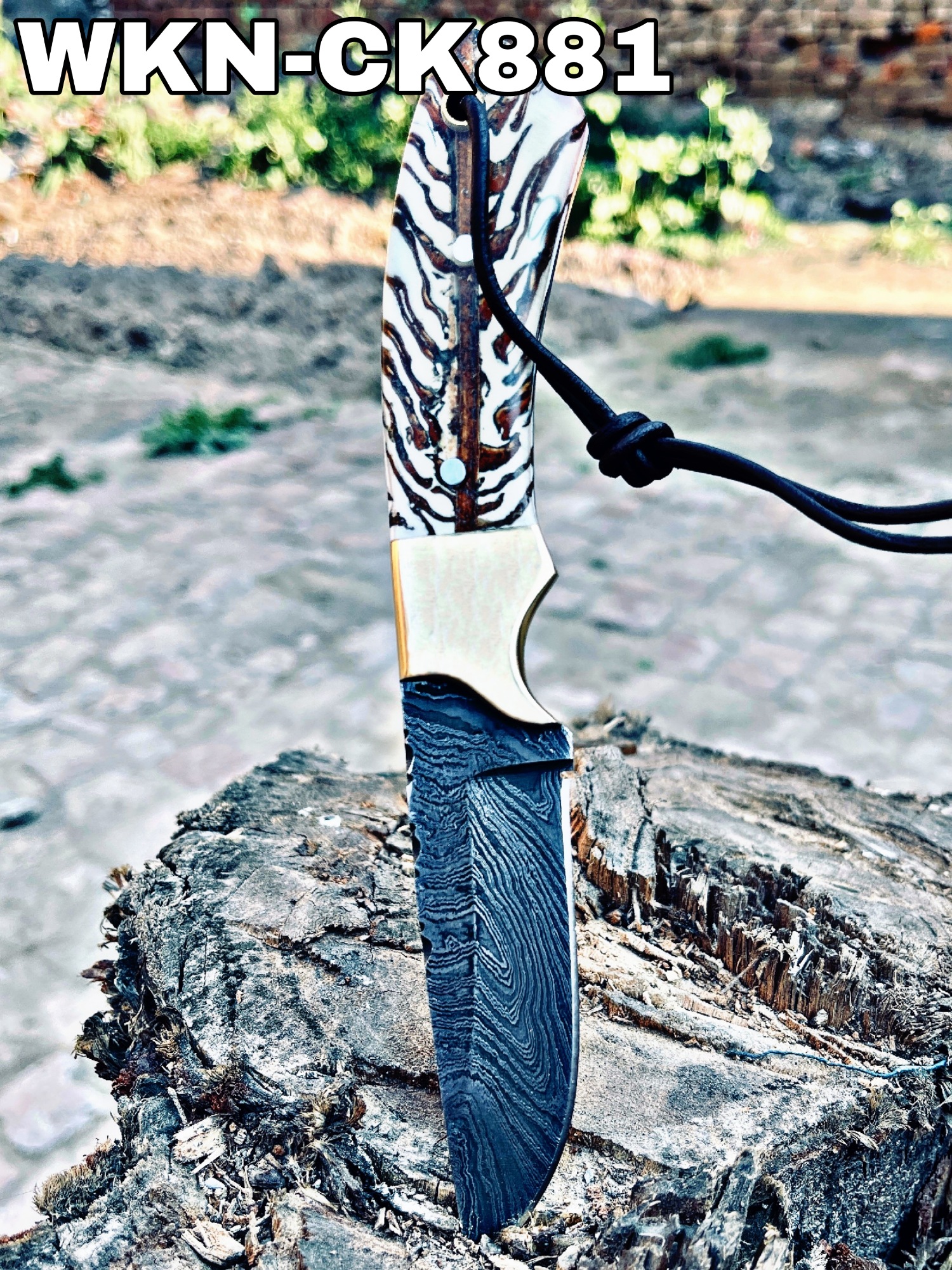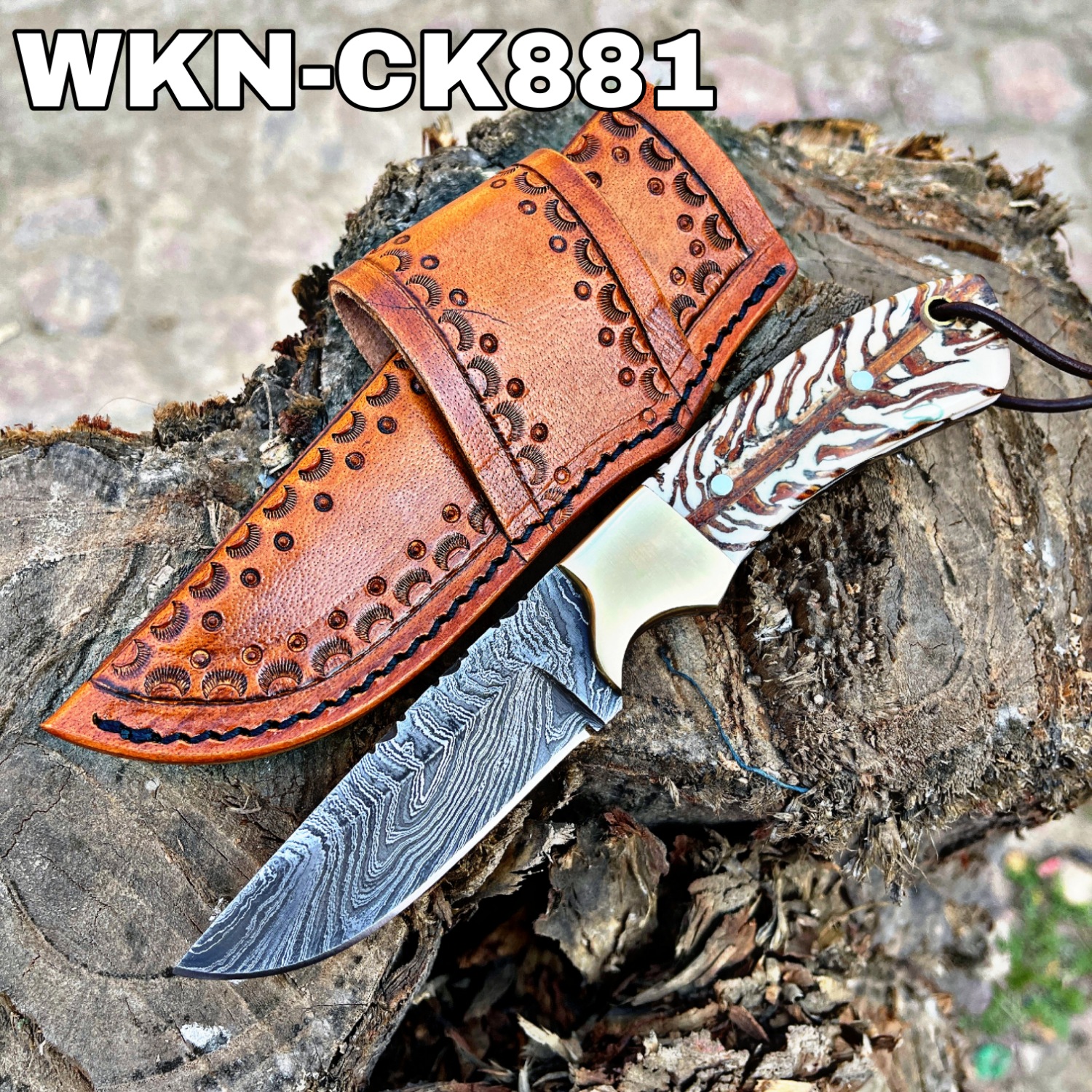 Custom Made Damascus Steel Fixed Blade Western Cowboy and Skinner knife. With Right Handed Sheath To Rest On Back Belt.