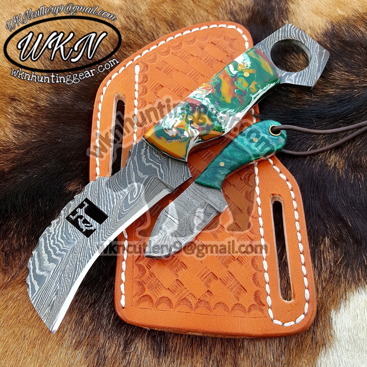 Custom Made Damascus Steel Fixed Blades Hawksbill Lineman and Skinner knives set…
