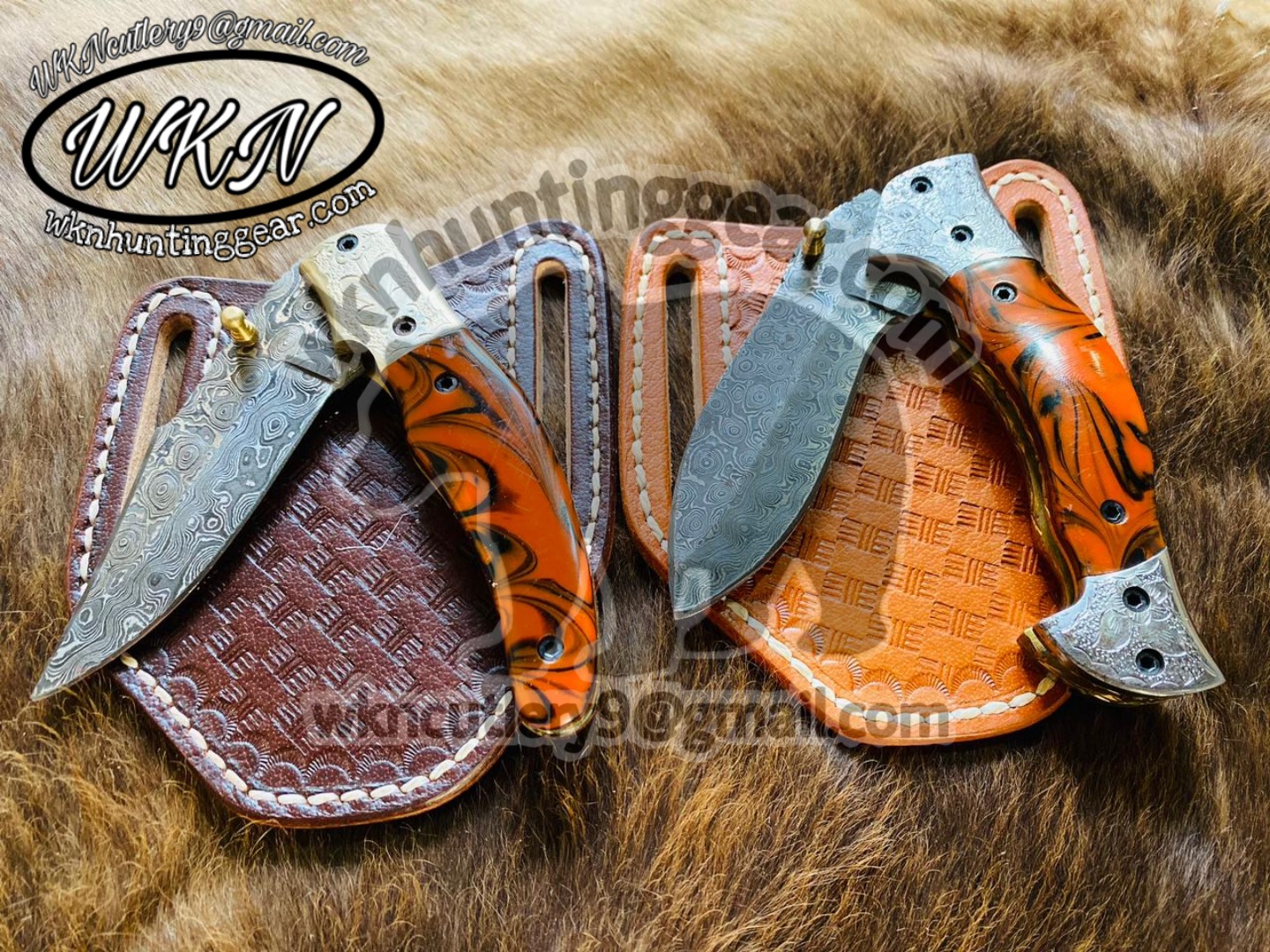 nCustom made Damascus Steel Folding knives set.