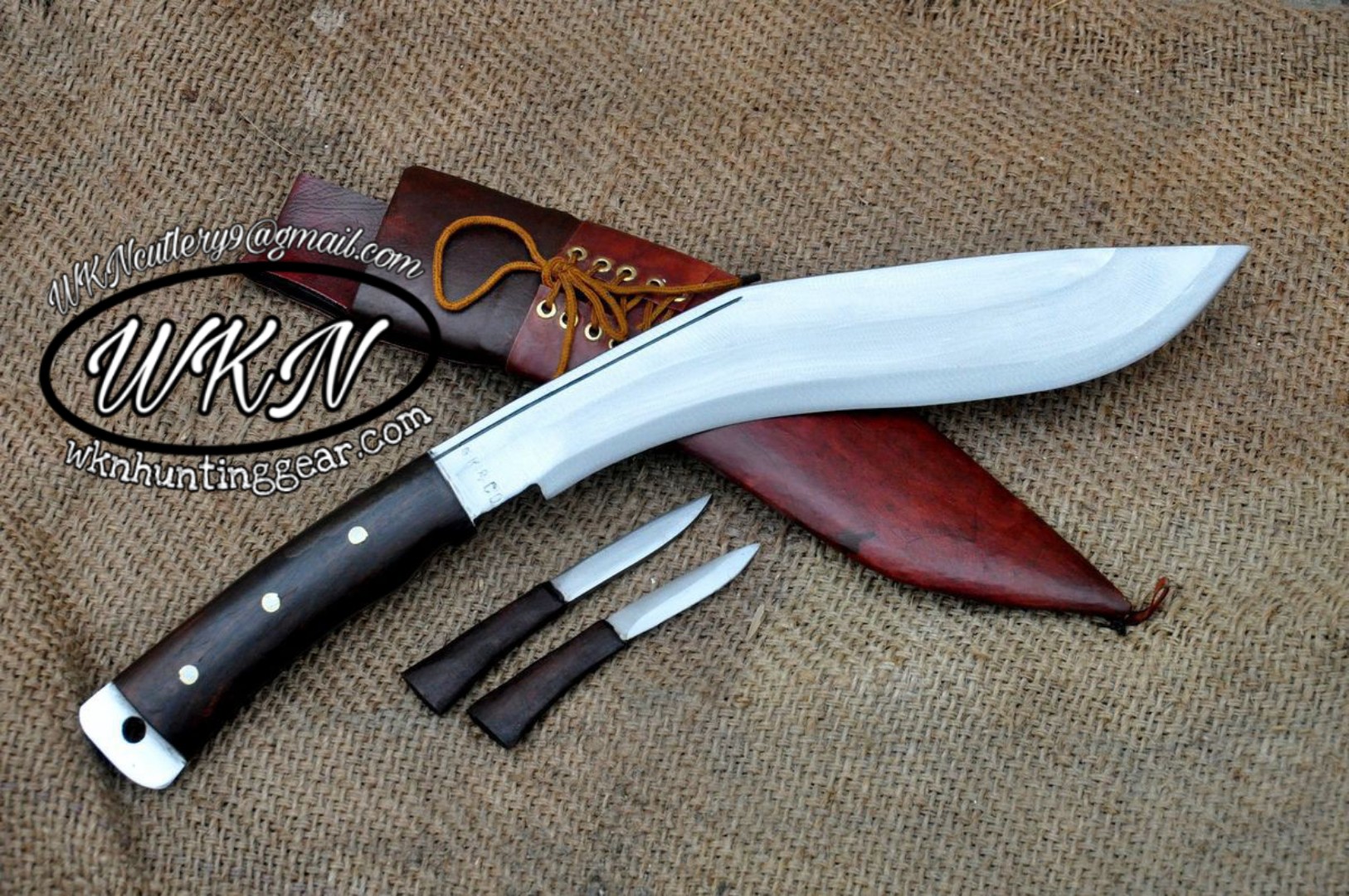 Custom Handmade High Carbon 1095 Steel Kukri knife.Overall length 16″ inches.and comes with 2 small knives. Handle Made of Black Micarta. Razor Sharp Blade And Hold an Edge.Comfortable Handle Grip And Comes With Leather Sheath…