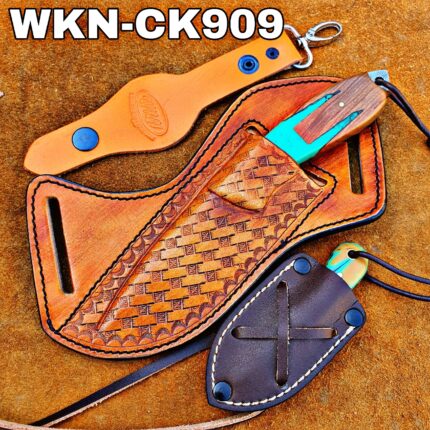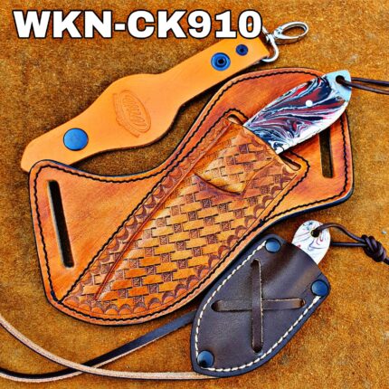 Custom Made Damascus Steel Fixed Blades Western Cowboy and Skinner knives Set. Left Handed Sheath To Rest On Back Belt…