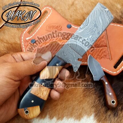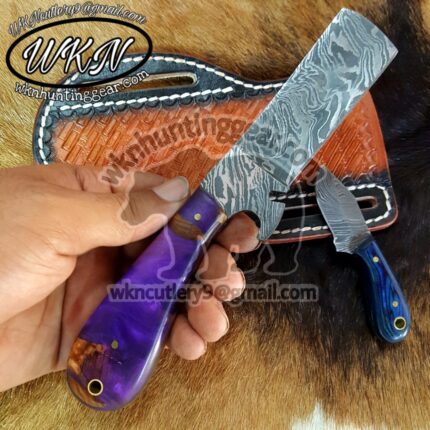 Original price was: $170.00.$104.99Current price is: $104.99.Custom Made Damascus and 1095 Bull Cutter and folding knives set…